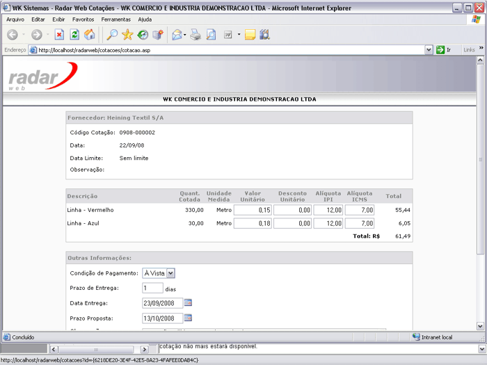 - Cotações de preços pela Internet, diretamente com o fornecedor, sem intervenção de terceiros, eliminando-se processos manuais de envio de documentos impressos;