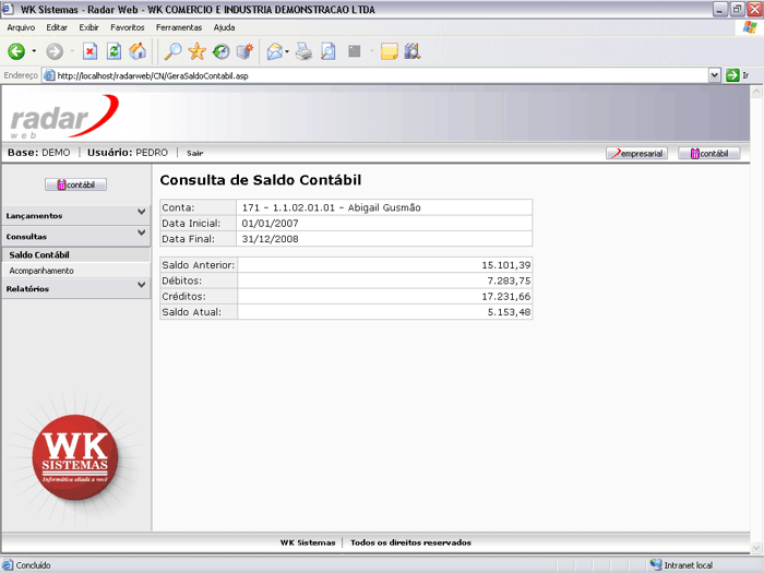 Permite fazer lançamentos (Contábil, Financeiro, Estoque e MTFiscal), consultas, alterações e acompanhamento de contas. Além disso, pode-se consultar diversos cadastros (clientes, plano de contas, fornecedores, etc) e visualizar/imprimir relatórios. Integra com o Radar Gerenciador permitindo inclusão, consulta, alteração (quantidade de horas gastas em cada serviço, inclusão de novos serviços e despesas, etc), além de impressão de atendimentos técnicos (relatórios de visitas).